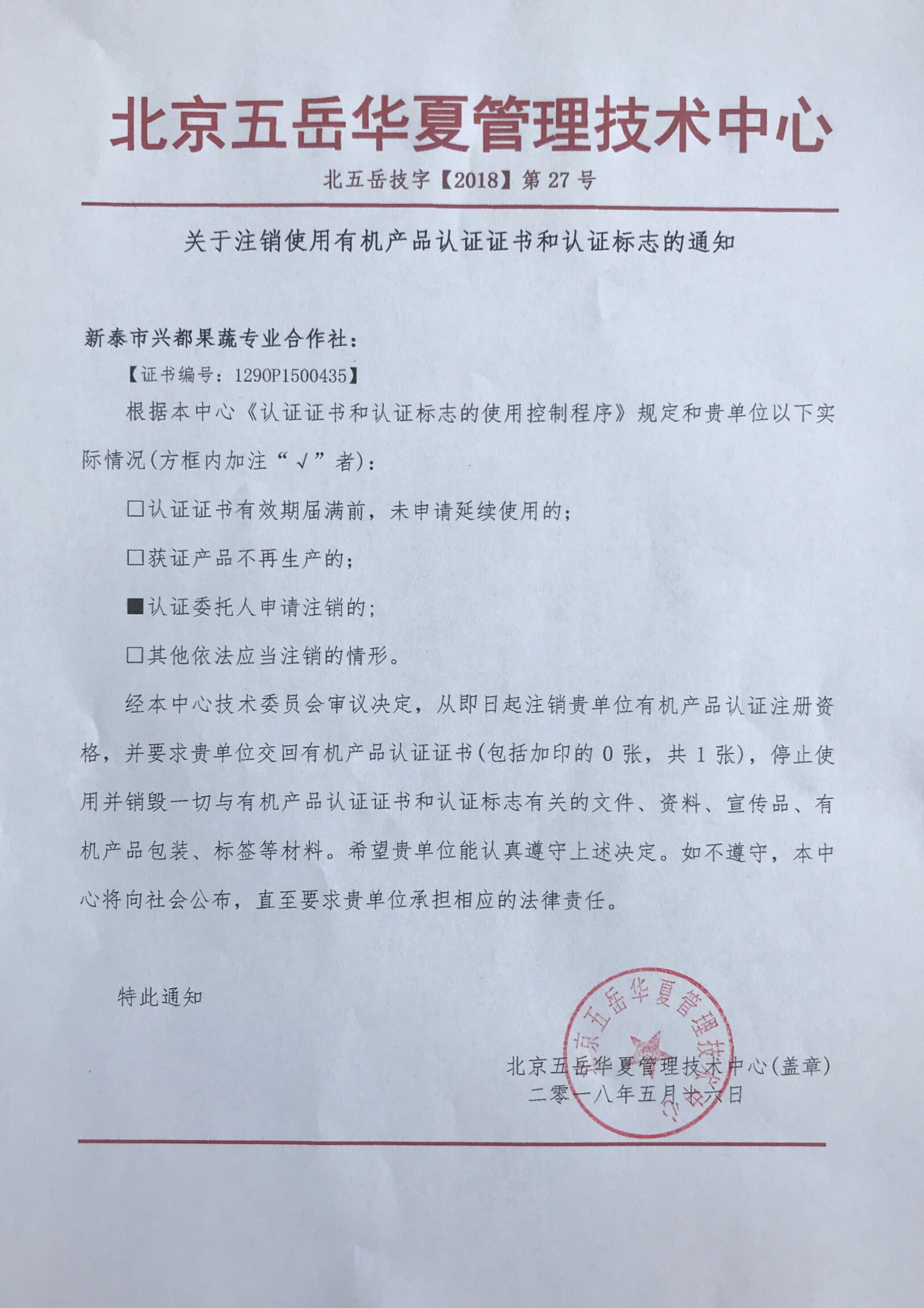 关于注销新泰市兴都果蔬专业合作社有机产品认证证书和认证标志的通知