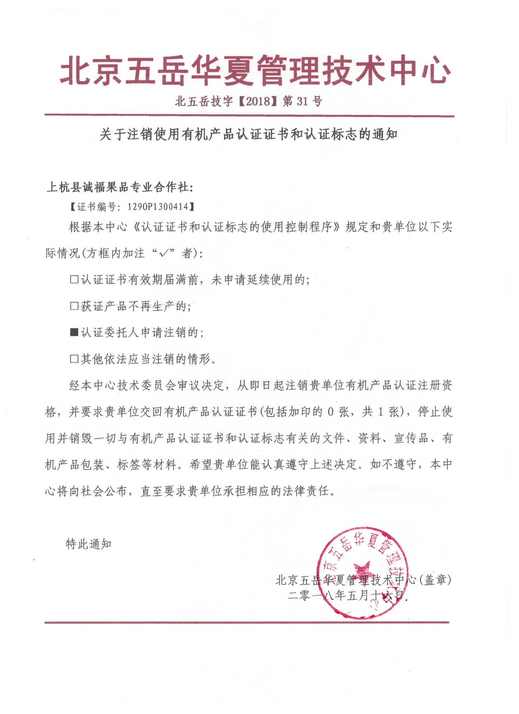 关于注销上杭县诚福果品专业合作社有机产品认证证书和认证标志的通知