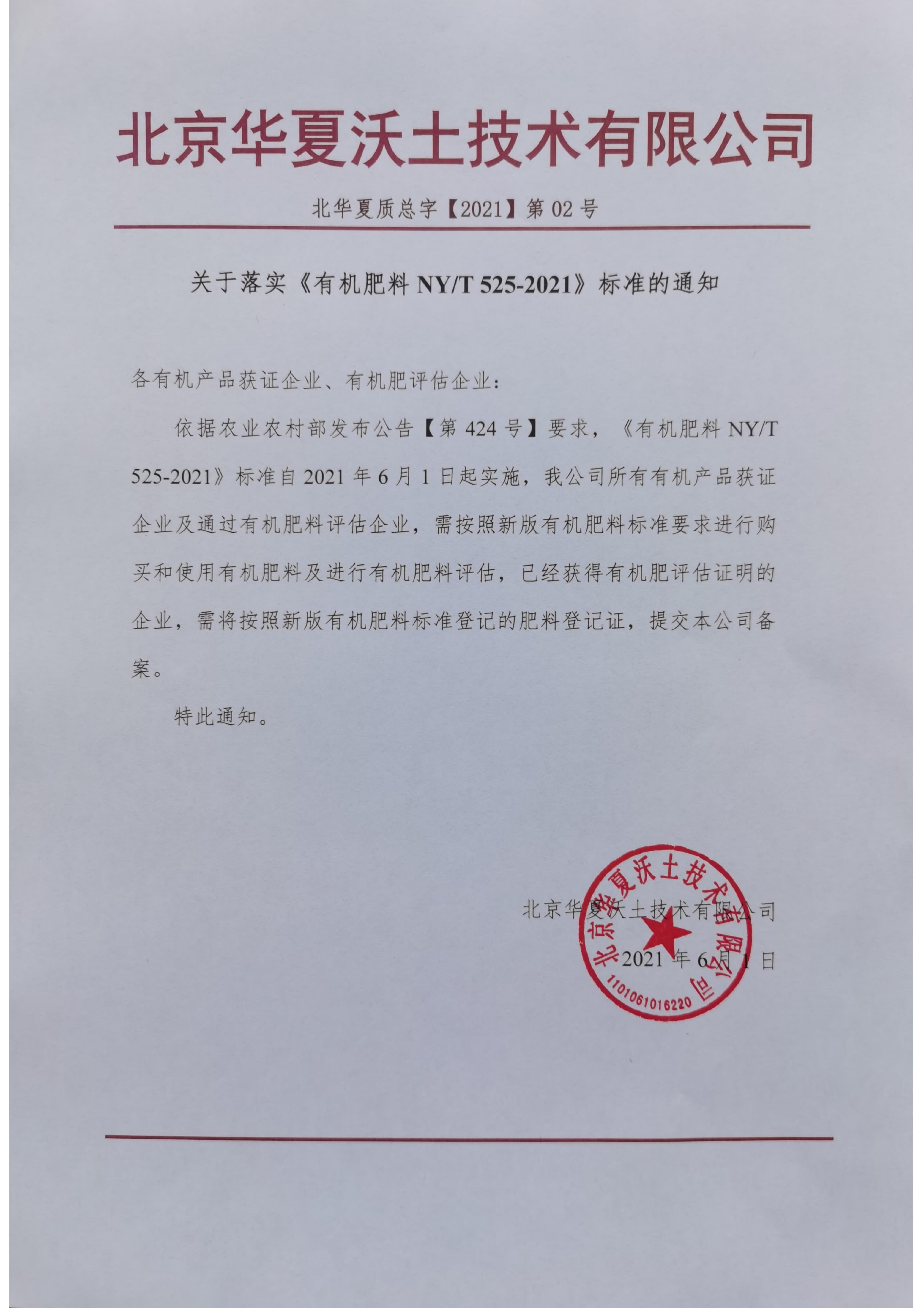 关于落实《有机肥料NY/T 525-2021》标准的通知