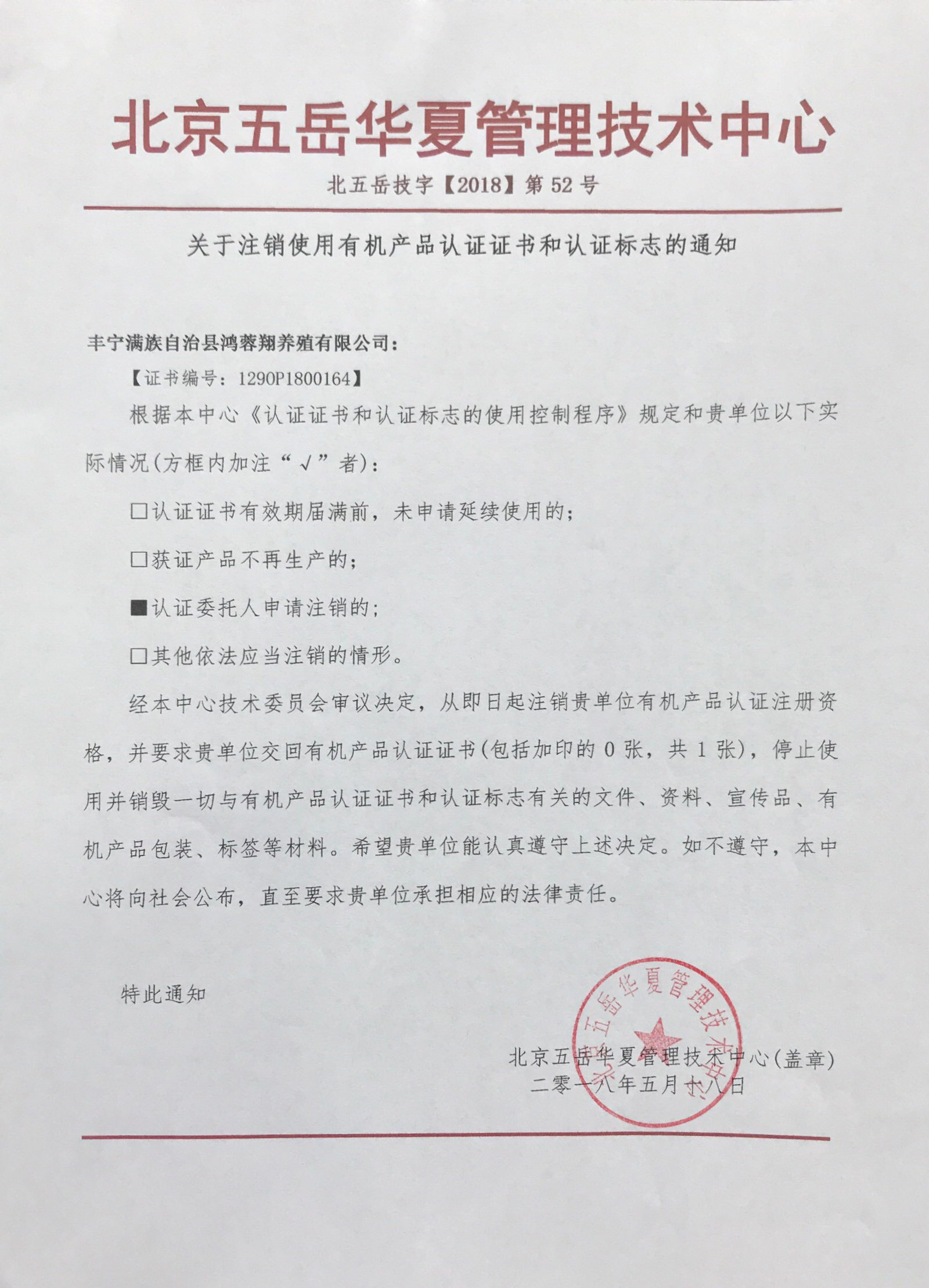 关于注销丰宁满族自治县鸿蓉翔养殖有限公司有机产品认证证书和认证标志的通知
