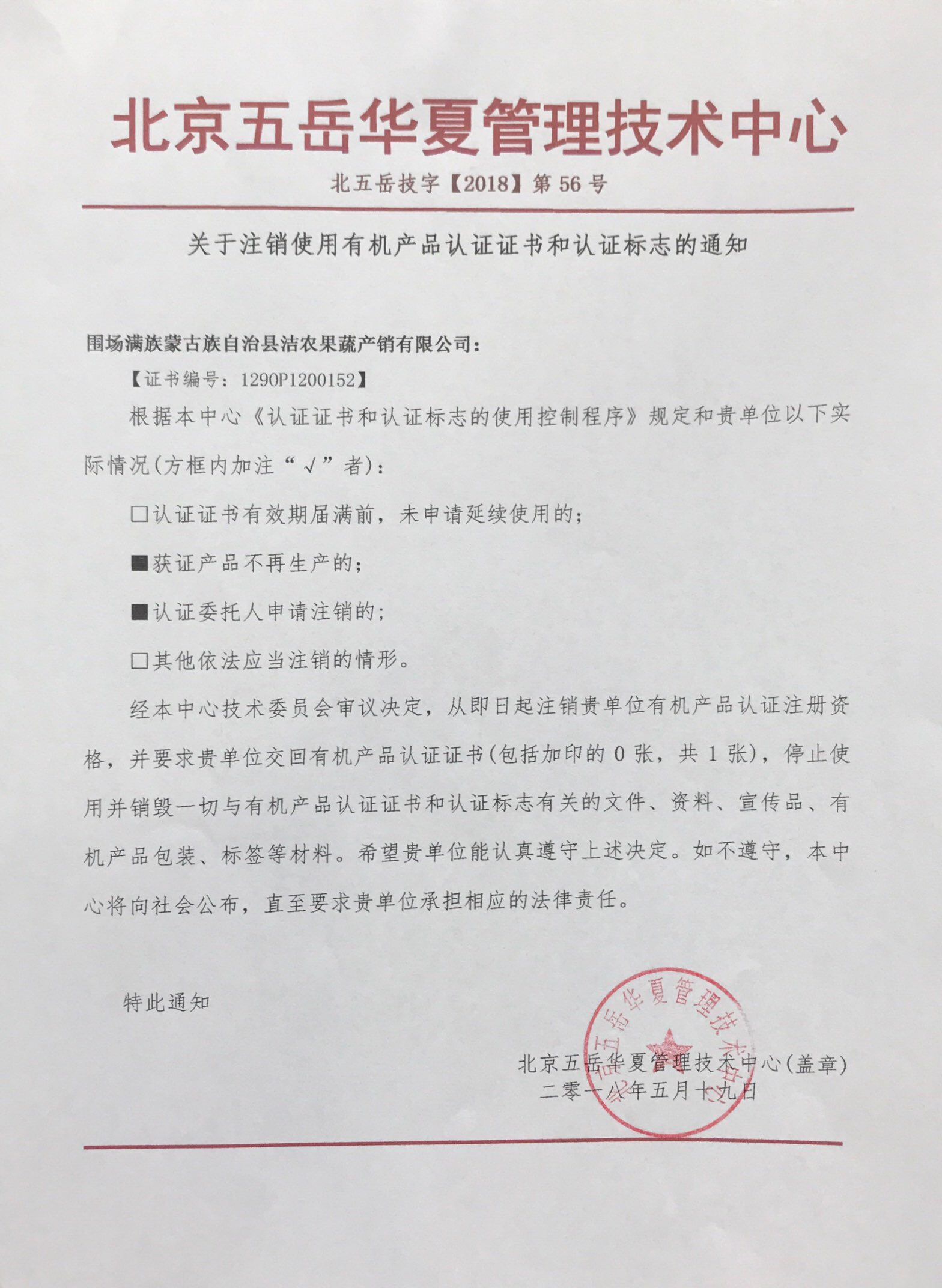 关于注销围场满族蒙古族自治县洁农果蔬产销有限公司有机产品认证证书和认证标志的通知