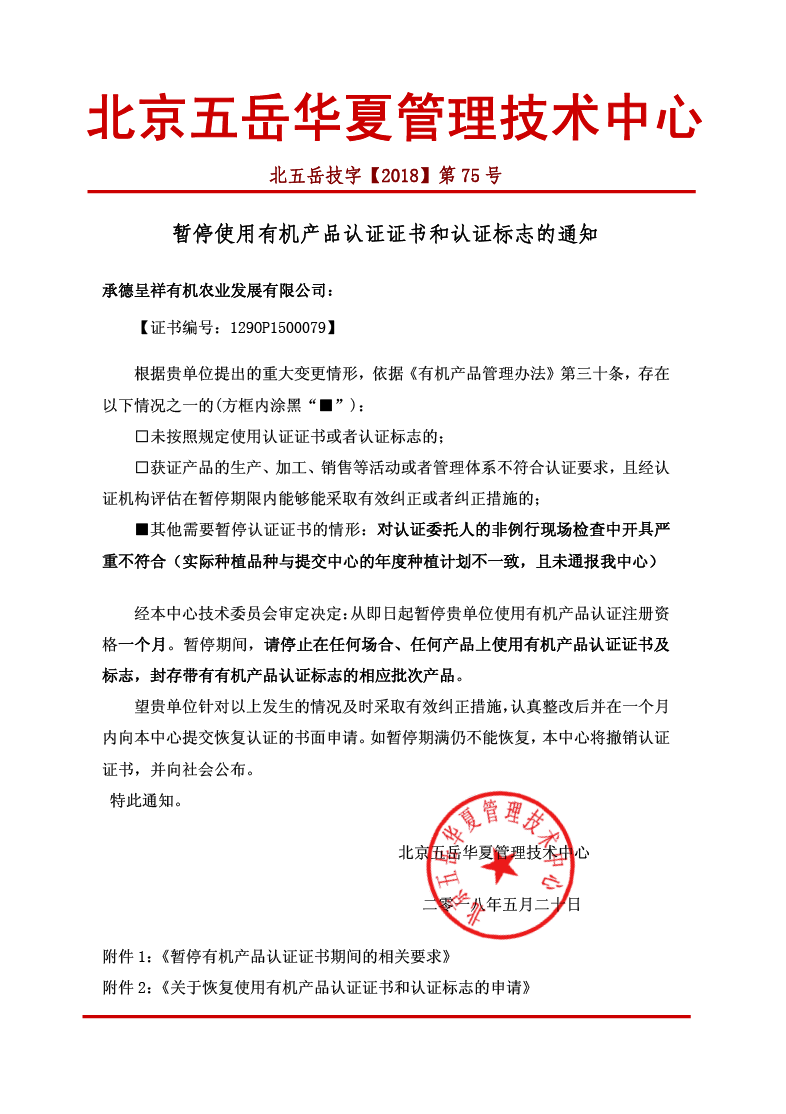 关于暂停承德呈祥有机农业发展有限公司有机产品认证证书和认证标志的通知