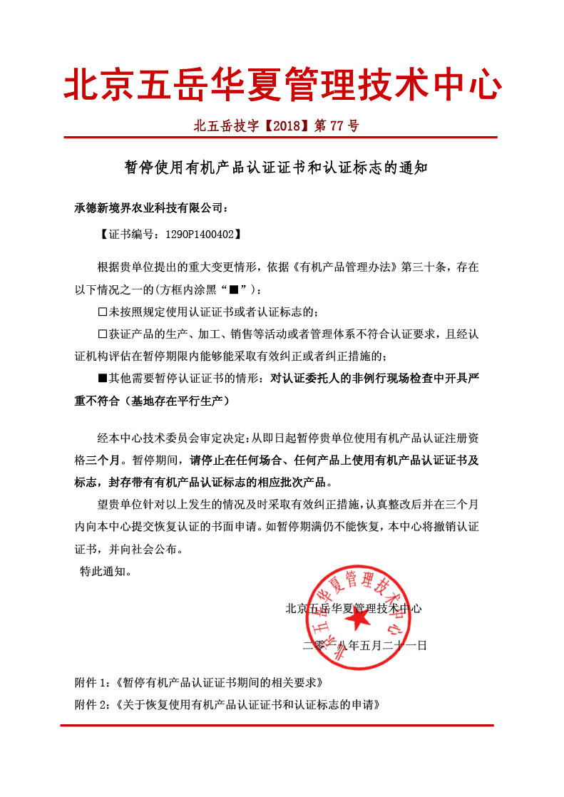 关于暂停承德新境界农业科技有限公司有机产品认证证书和认证标志的通知