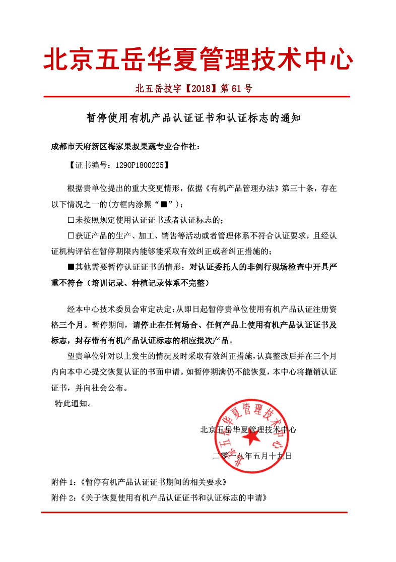 关于暂停成都市天府新区梅家果叔果蔬专业合作社有机产品认证证书和认证标志的通知