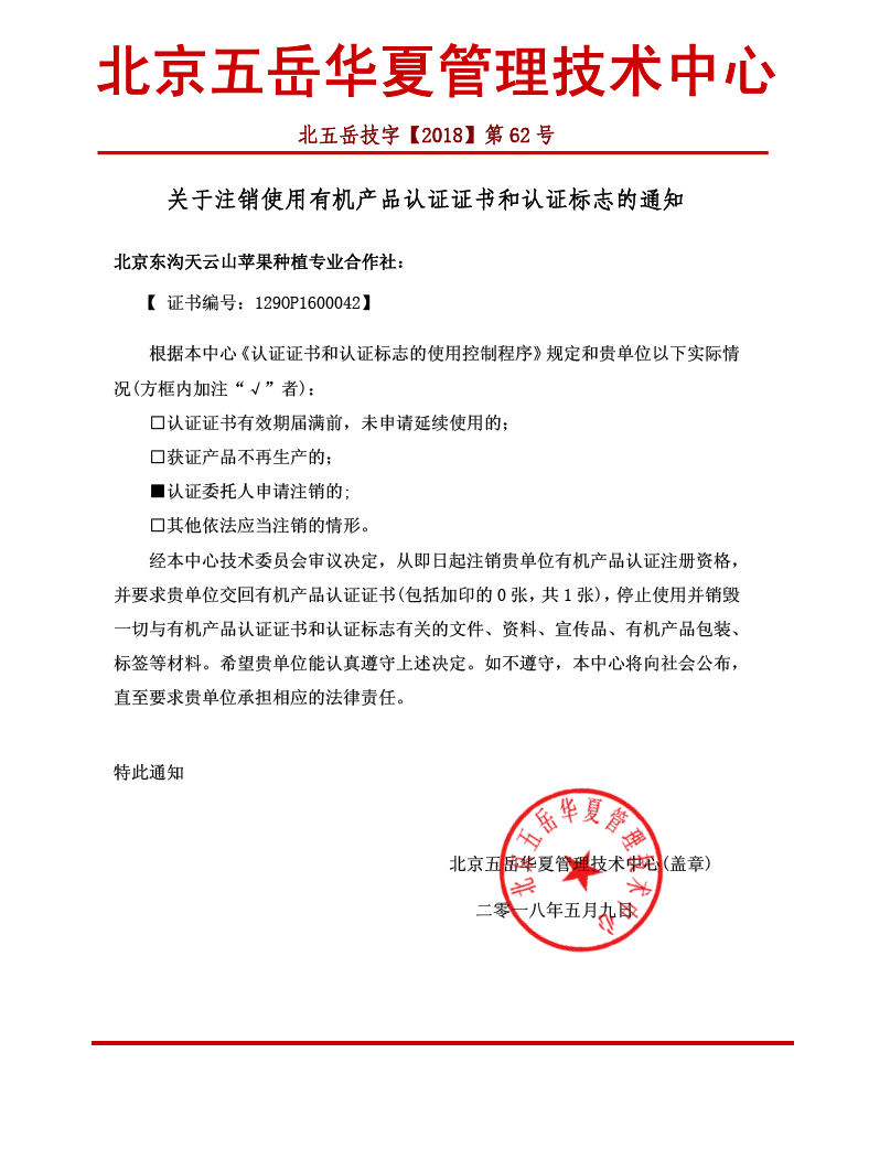 关于注销北京东沟天云山苹果种植专业合作社有机产品认证证书和认证标志的通知