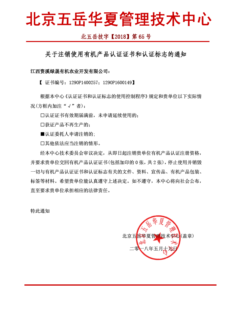 关于注销江西资溪绿晟有机农业开发有限公司有机产品认证证书和认证标志的通知