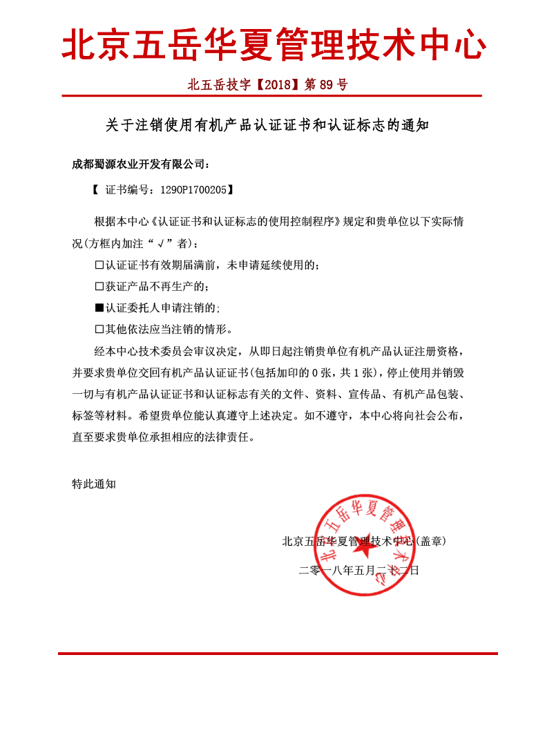 关于注销成都蜀源农业开发有限公司有机产品认证证书和认证标志的通知