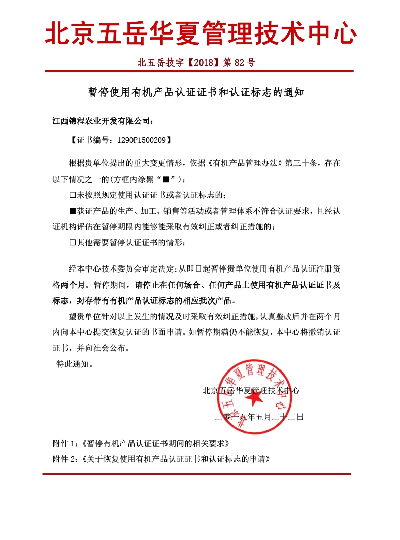 关于暂停江西锦程农业开发有限公司有机产品认证证书和认证标志的通知