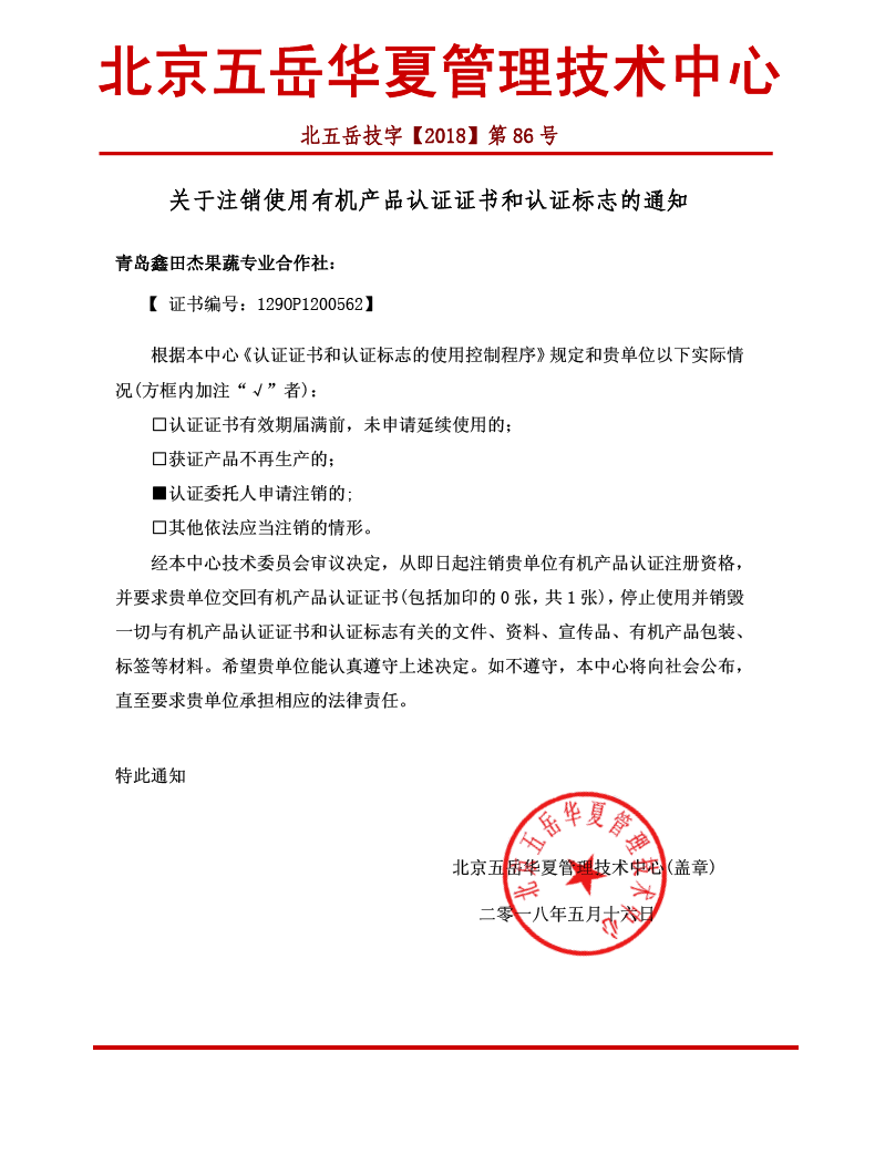 关于注销青岛鑫田杰果蔬专业合作社有机产品认证证书和认证标志的通知