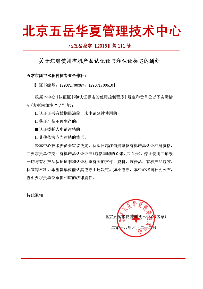 关于注销五常市庞宇水稻种植专业合作社有机产品认证证书和认证标志的通知