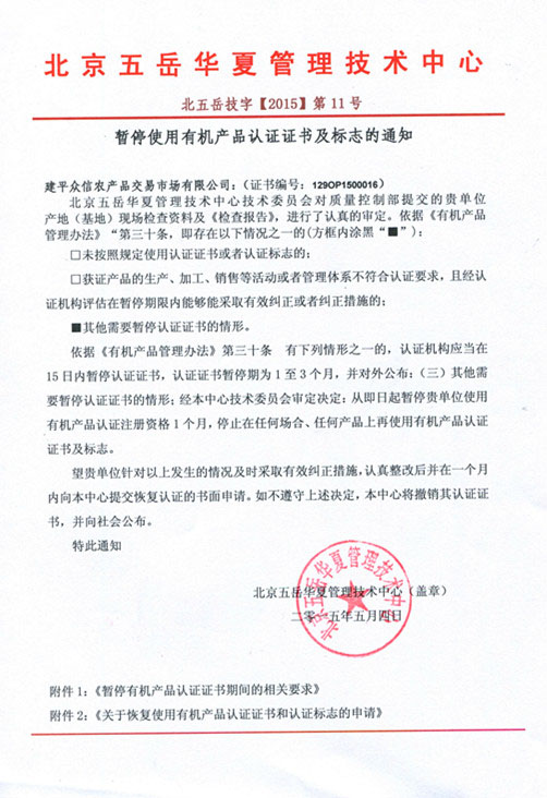 关于暂停使用有机产品认证证书及标志的通知