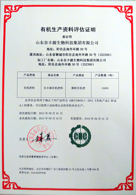 关于山东谷丰源生物科技集团有限公司获得我中心有机生产材料评估证明的公告