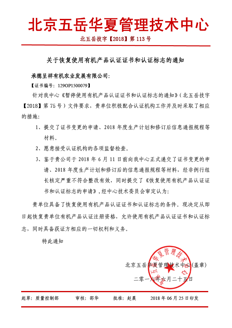 关于恢复承德呈祥有机农业发展有限公司有机产品认证证书和认证标志的通知