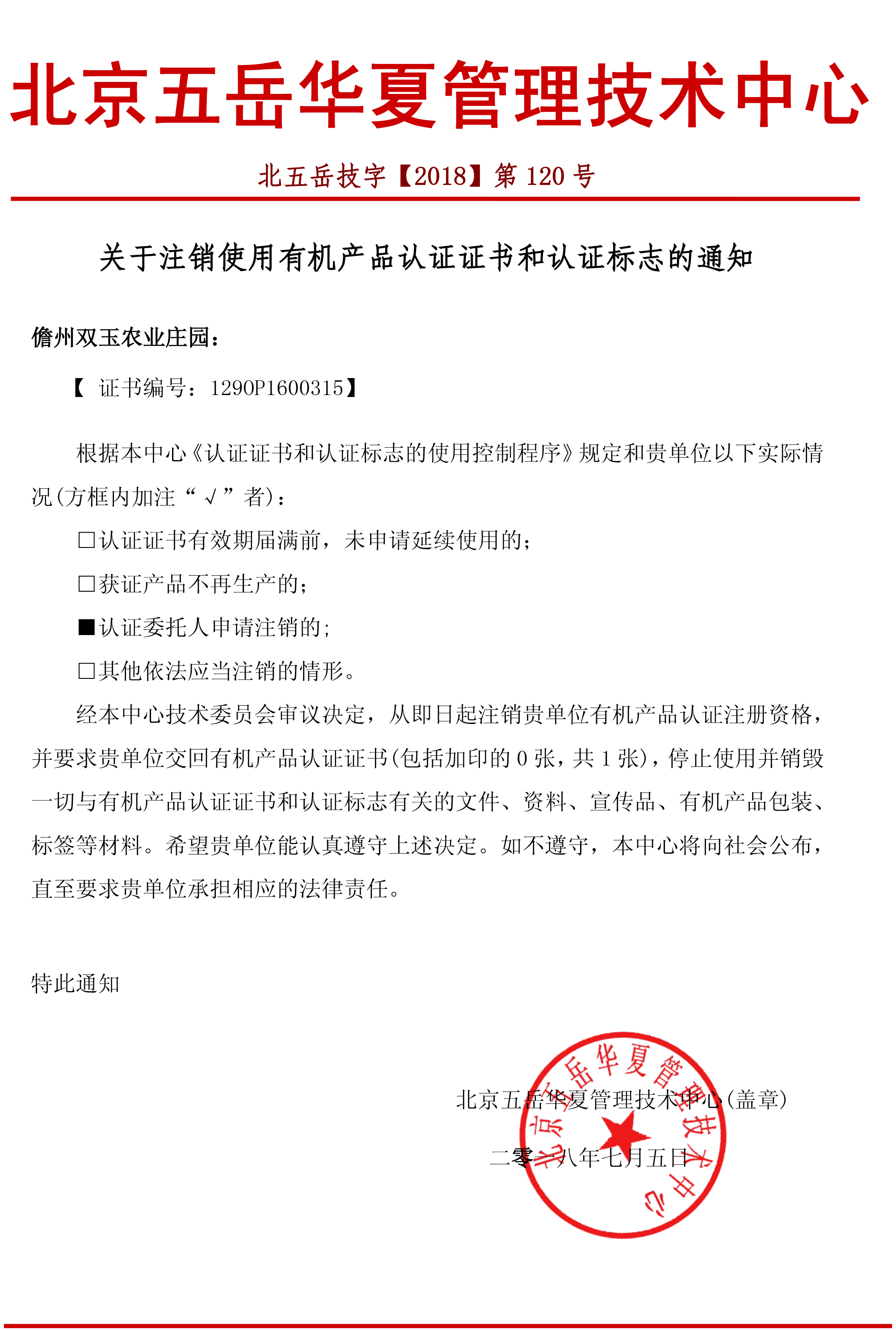 关于注销儋州双玉农业庄园有机产品认证证书和认证标志的通知