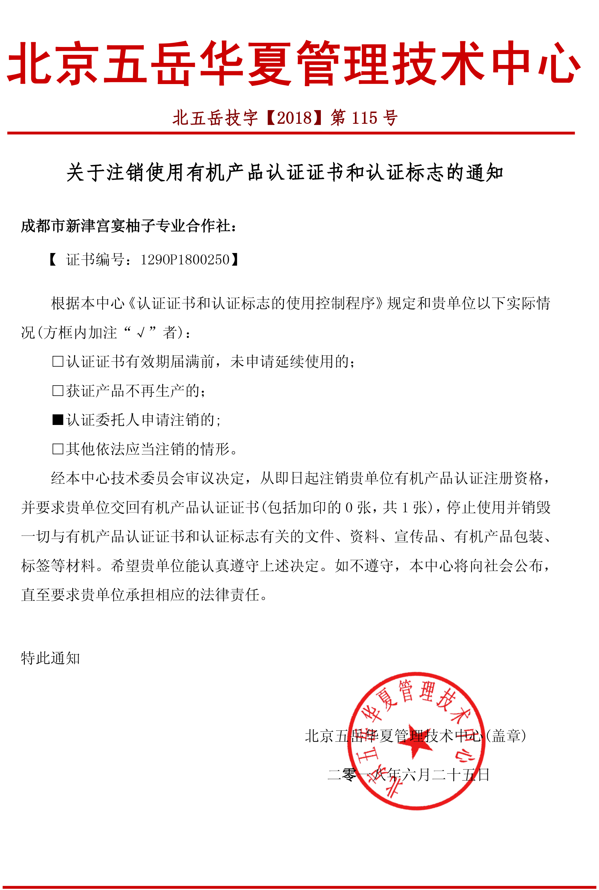 关于注销成都市新津宫宴柚子专业合作社有机产品认证证书和认证标志的通知