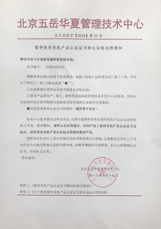 关于注销潍坊市坊子区惠群果蔬种植家庭农场有机产品认证证书和认证标志的通知