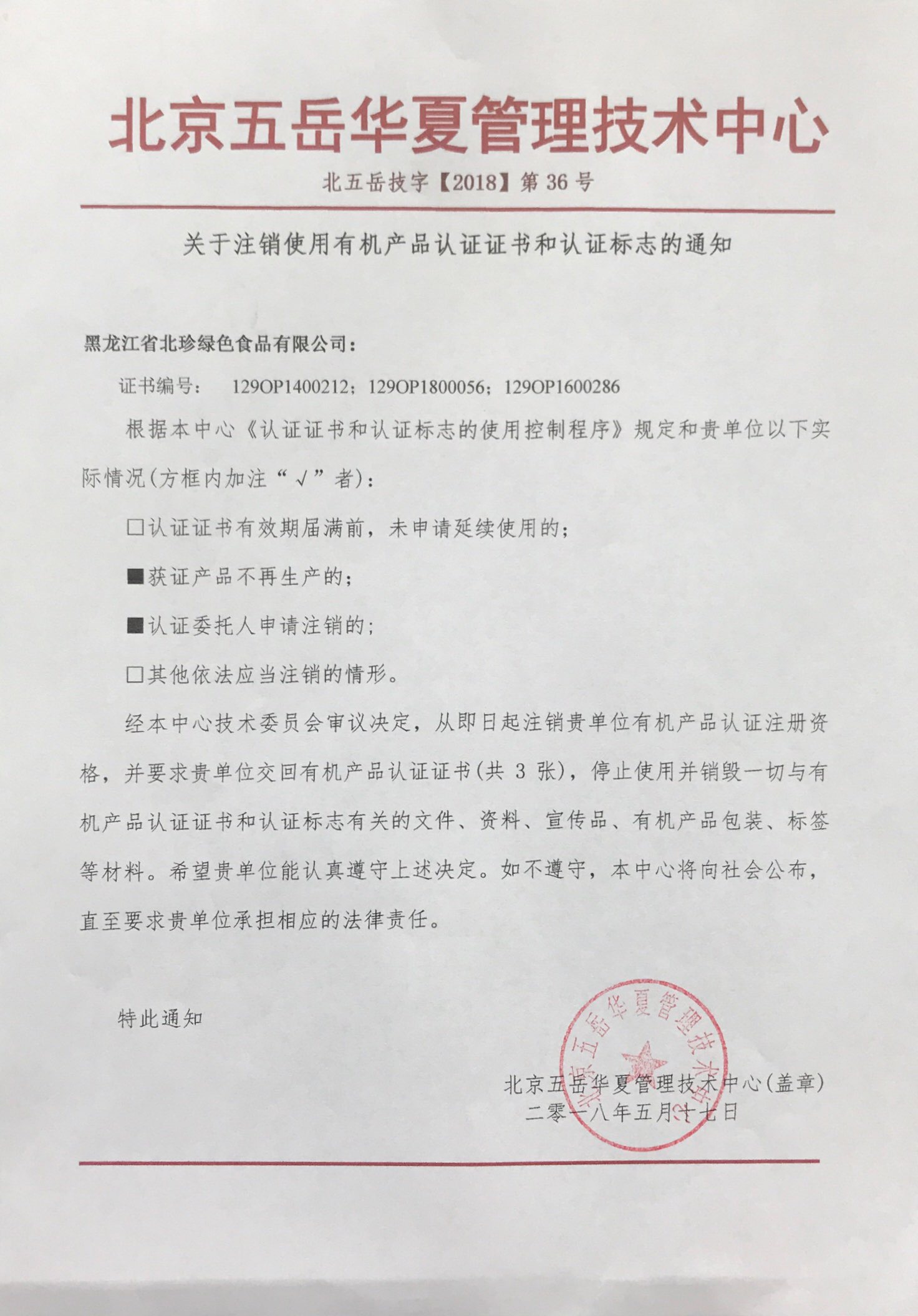 关于注销黑龙江省北珍绿色食品有限公司有机产品认证证书和认证标志的通知
