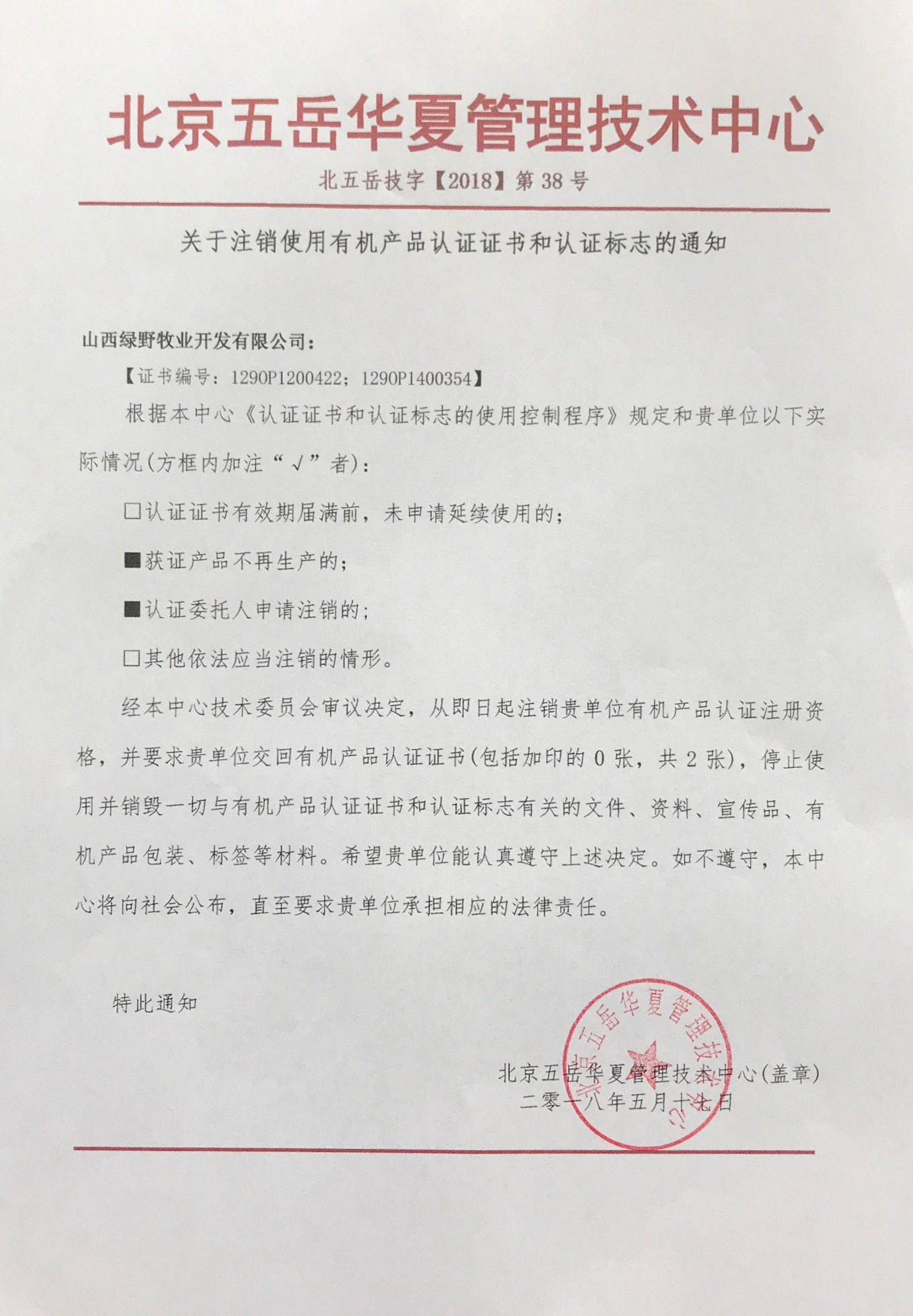 关于注销山西绿野牧业开发有限公司有机产品认证证书和认证标志的通知