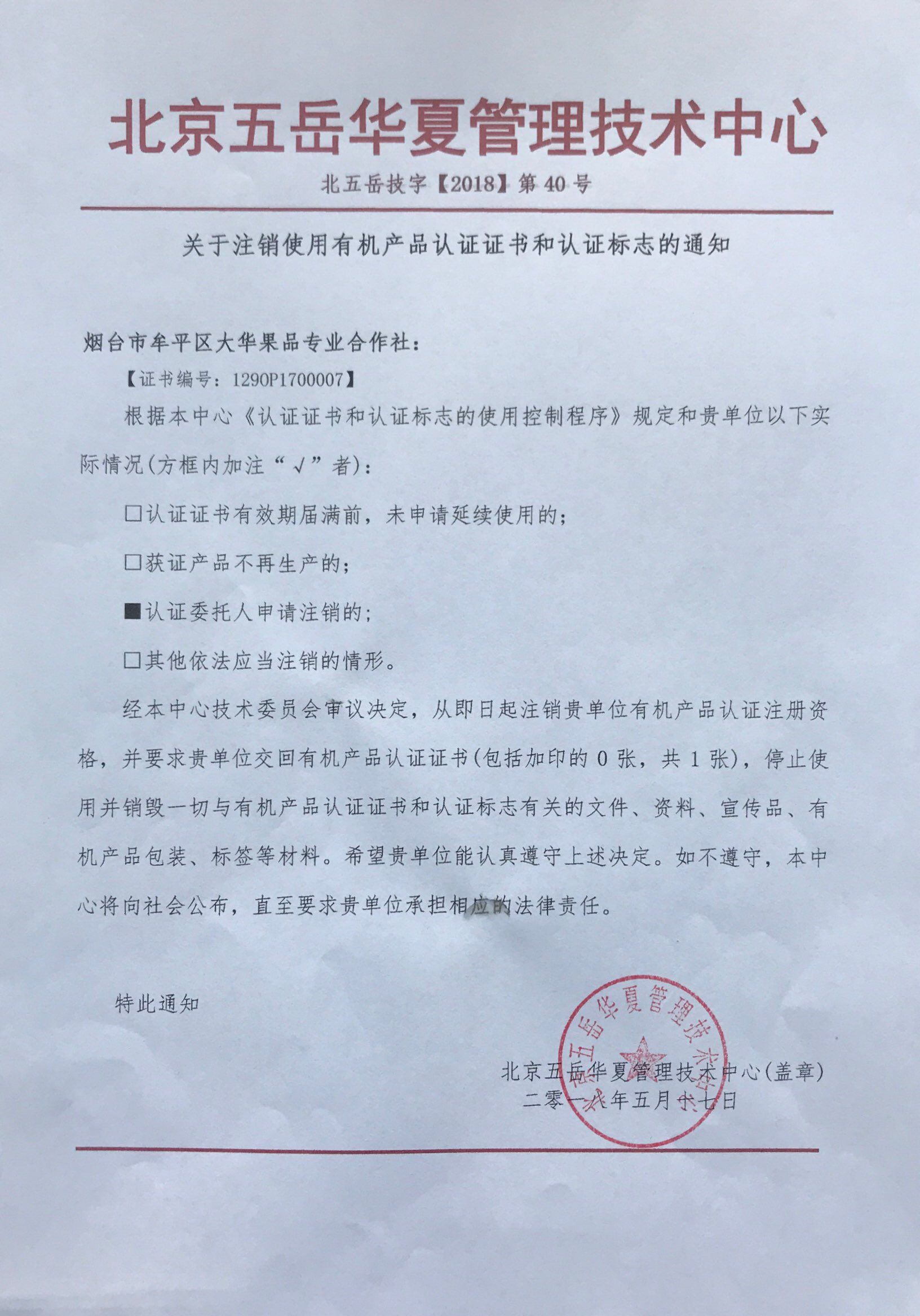 关于注销烟台牟平区大华果品专业合作社有机产品认证证书和认证标志的通知