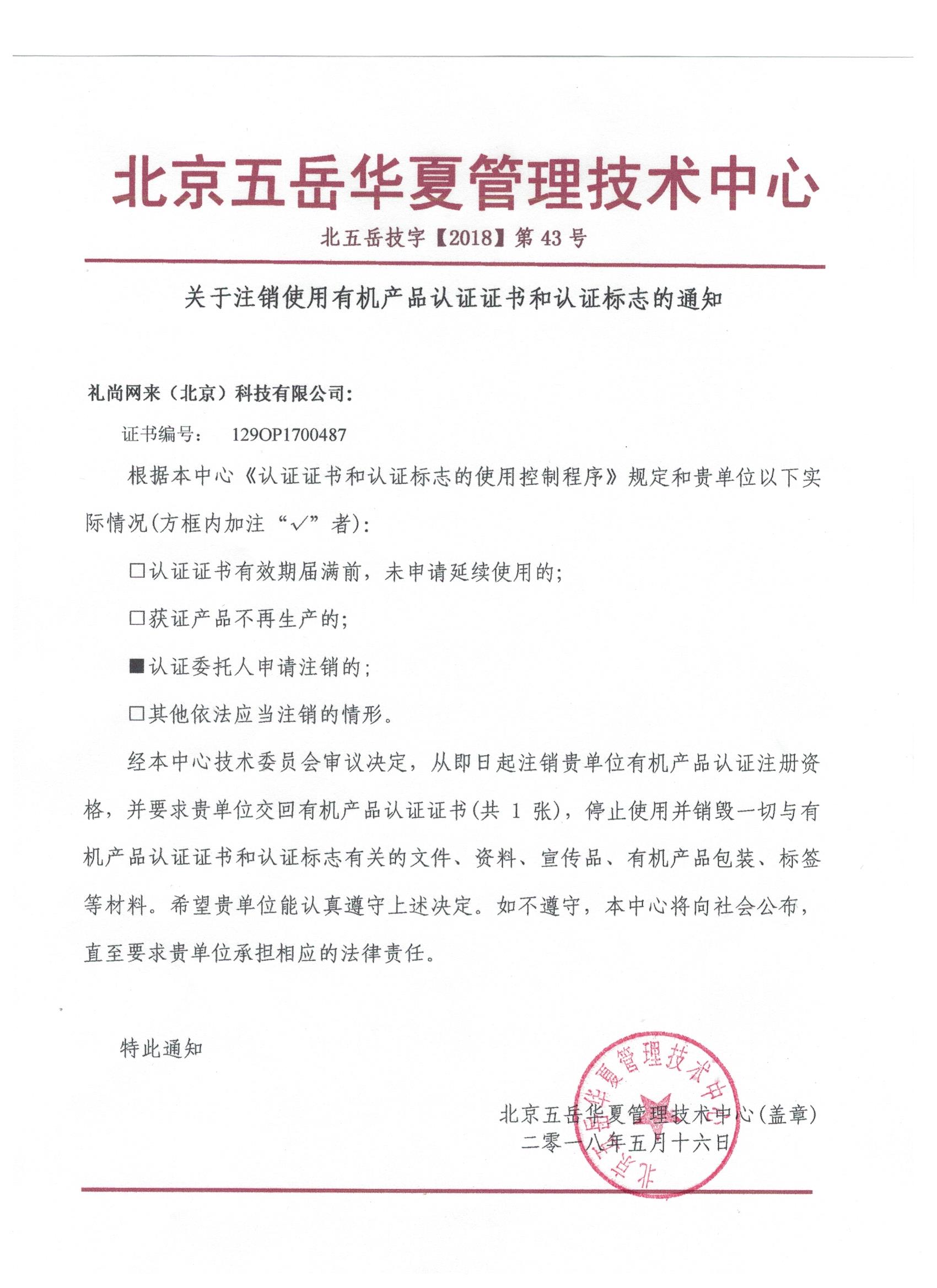 关于注销礼尚网来(北京)科技有限公司有机产品认证证书和认证标志的通知
