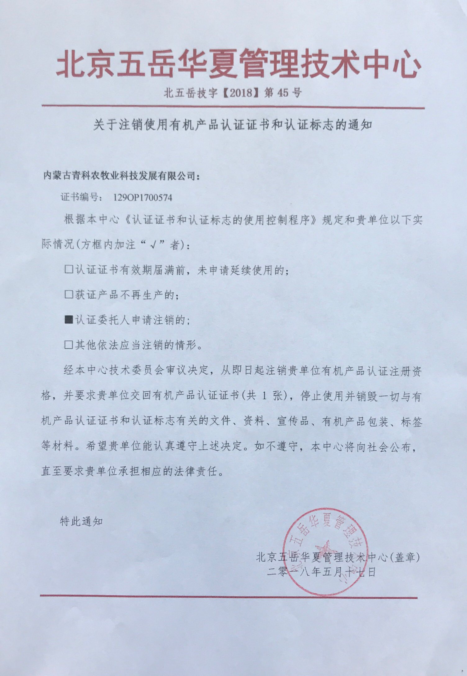 关于注销内蒙古青科农牧业科技发展有限公司有机产品认证证书和认证标志的通知