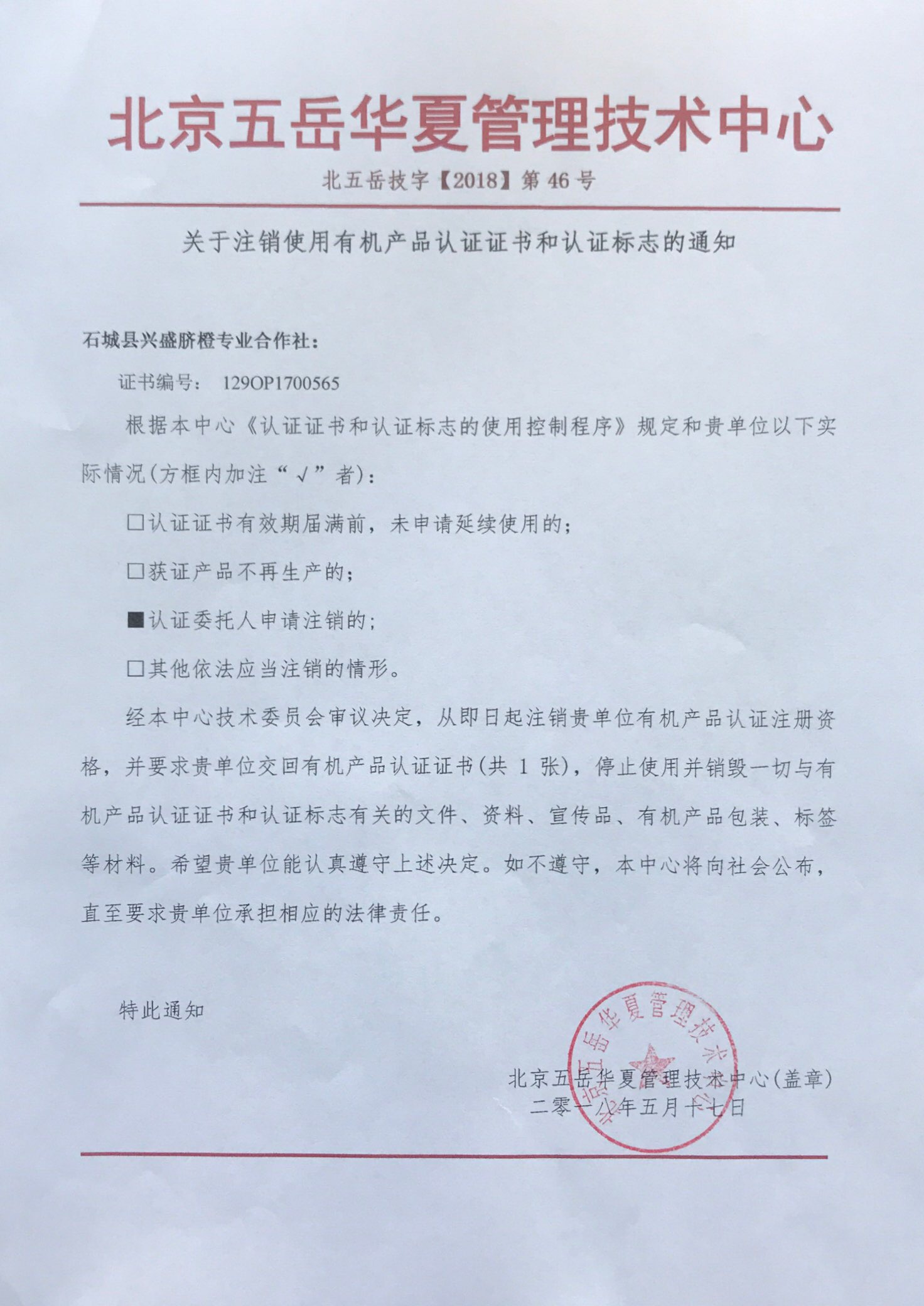 关于注销石城县兴盛脐橙专业合作社有机产品认证证书和认证标志的通知