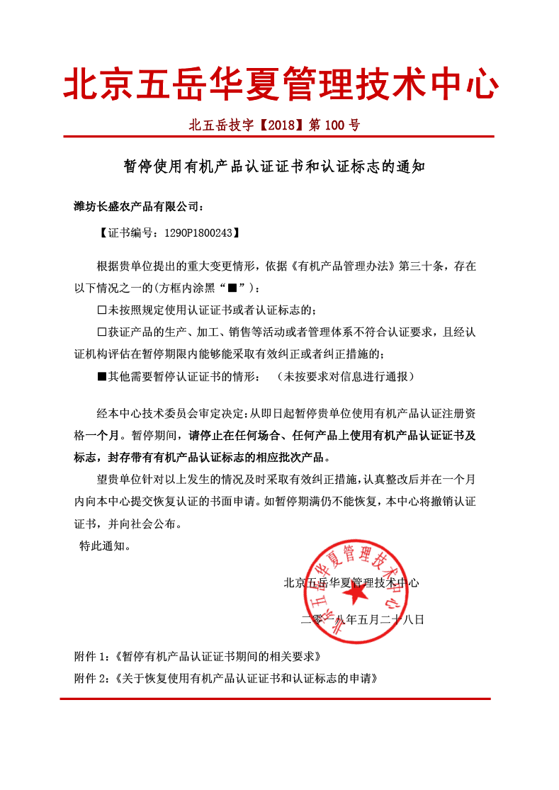 关于暂停潍坊长盛农产品有限公司有机产品认证证书和认证标志的通知