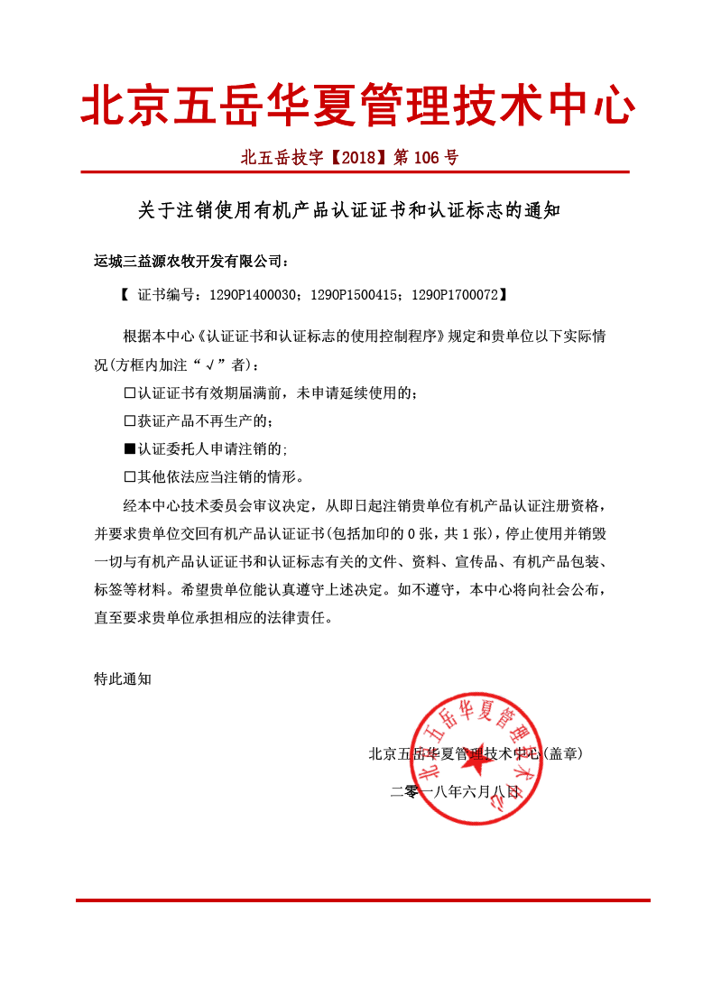 关于注销运城三益源农牧开发有限公司有机产品认证证书和认证标志的通知