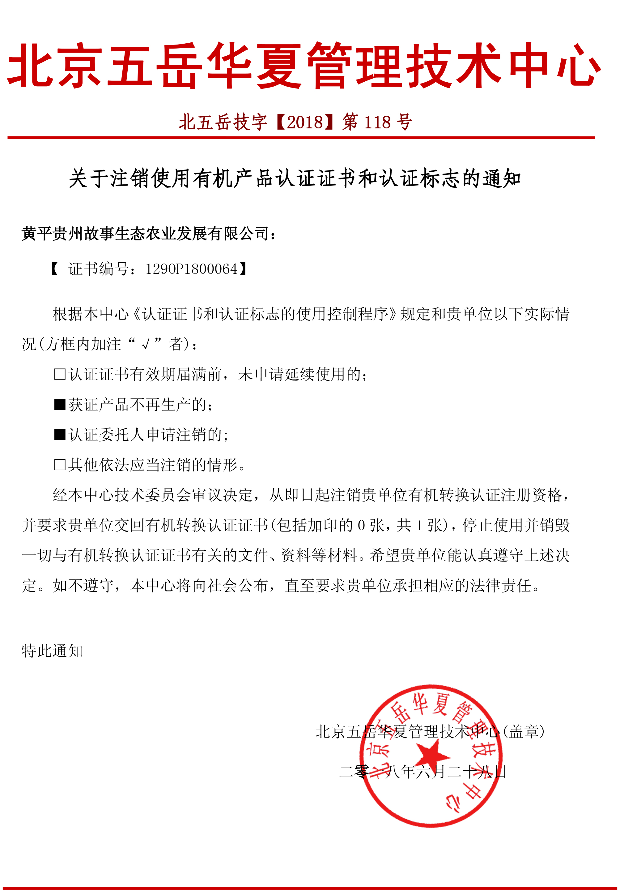 关于注销黄平贵州故事生态农业发展有限公司有机产品认证证书和认证标志的通知
